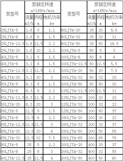 四、LJYA型液下料漿泵工作性能表