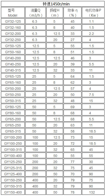五、GY型熔鹽泵性能參數表